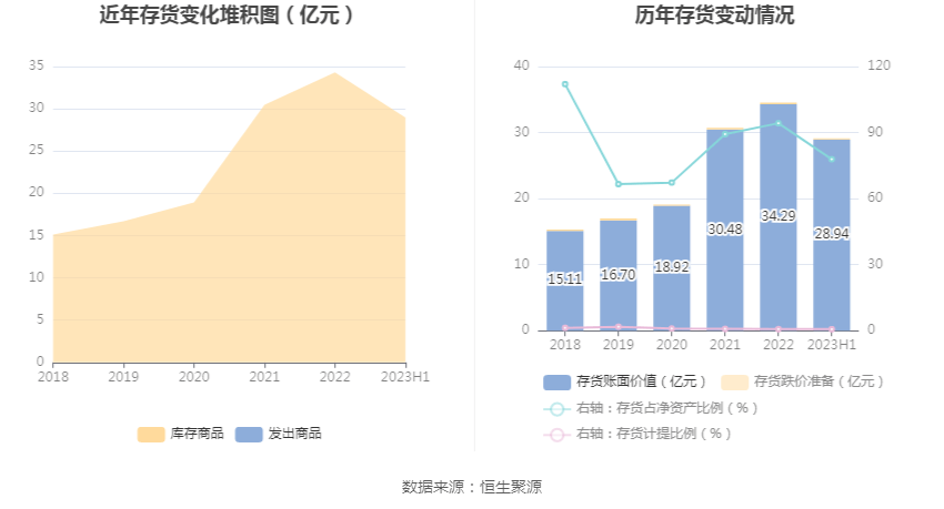 从存货变动来看,截至2023年上半年末,公司存货账面价值为28.94亿元,占净资产的77.9%,较上年末减少5.35亿元。其中,存货跌价准备为2024.44万元,计提比例为0.69%。