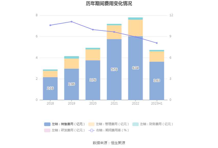 2023年上半年,公司期间费用为4.75亿元,较上年同期增加7451.07万元;期间费用率为8.09%,较上年同期上升0.65个百分点。其中,销售费用同比增长15.55%,管理费用同比增长21.21%,财务费用同比增长160.47%。