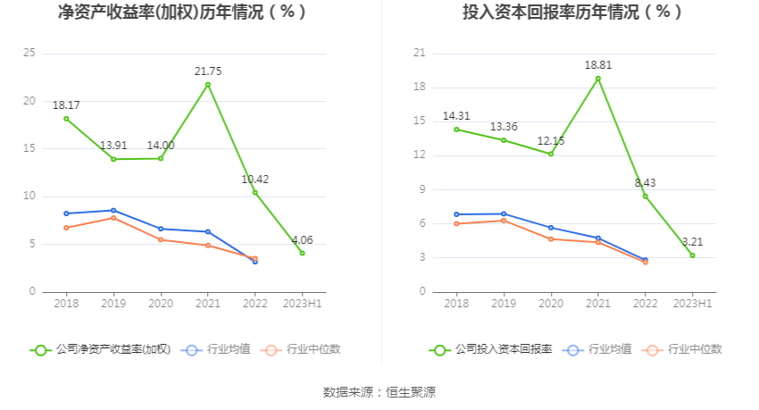 数据显示,2023年上半年公司加权平均净资产收益率为4.06%,较上年同期下降4.98个百分点;公司2023年上半年投入资本回报率为3.21%,较上年同期下降4.60个百分点。