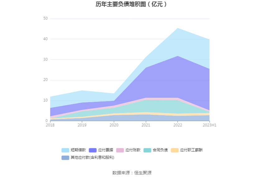 负债重大变化方面,截至2023年二季度末,公司合同负债较上年末减少91.20%,占公司总资产比重下降7.02个百分点;其他流动负债较上年末减少85.76%,占公司总资产比重下降0.91个百分点;短期借款较上年末增加4.92%,占公司总资产比重上升1.88个百分点;应付账款较上年末减少46.68%,占公司总资产比重下降0.62个百分点。