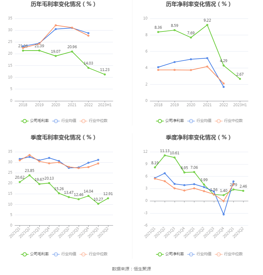 2023年上半年,公司毛利率为11.23%,同比下降3.42个百分点;净利率为2.67%,较上年同期下降3.35个百分点。从单季度指标来看,2023年第二季度公司毛利率为12.91%,同比下降0.56个百分点,环比上升2.64个百分点;净利率为2.46%,较上年同期下降1.53个百分点,较上一季度下降0.33个百分点。