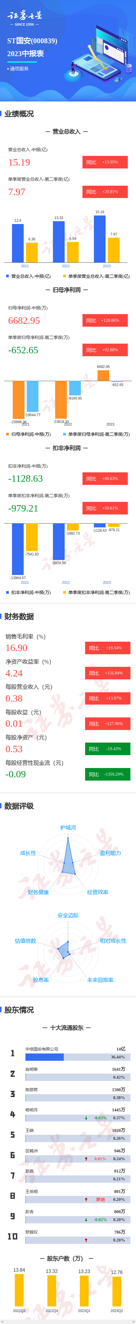 ST国安2023中报显示,公司主营收入15.19亿元,同比上升13.95%;归母净利润6682.95万元,同比上升128.06%;扣非净利润-1128.63万元,同比上升88.63%;其中2023年第二季度,公司单季度主营收入7.97亿元,同比上升20.81%;单季度归母净利润-652.66万元,同比上升92.88%;单季度扣非净利润-979.22万元,同比上升50.61%;负债率79.9%,投资收益-4401.9万元,财务费用6069.81万元,毛利率16.9%。