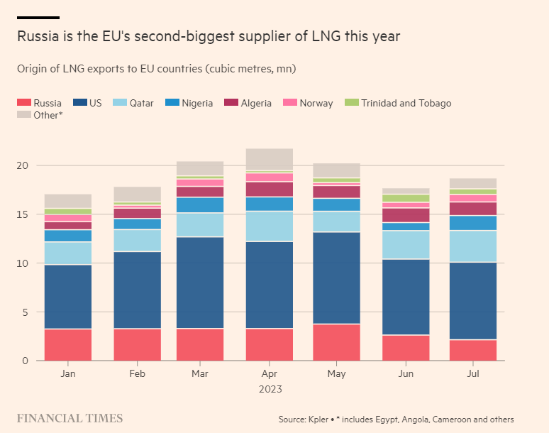 在欧盟继续收紧对俄制裁之际,对俄罗斯的LNG进口不仅导致数十亿美元的收入流向俄罗斯,其依赖程度还将使欧盟面临克里姆林宫突然决定削减供应的风险,就像去年管道天然气供应被掐断一样。