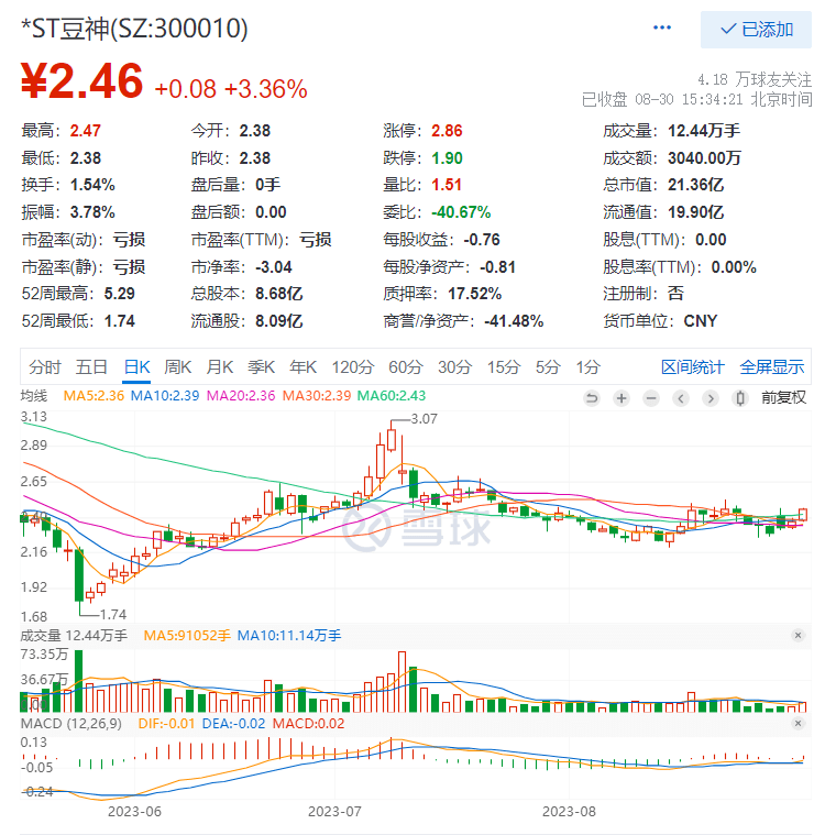 截至2023年8月30日,*ST豆神的股价报收2.46元,涨幅为3.36%,总市值为21.36亿元。