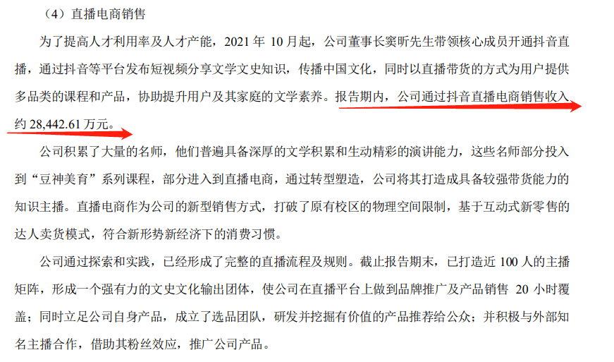 2021年10月起,公司董事长窦昕带领核心成员开通抖音直播带货,上半年公司通过抖音直播电商销售收入为2.84亿元。豆神在财报中称已打造近100人的主播矩阵,使公司在直播平台上做到品牌推广及产品销售20小时覆盖,并成立了选品团队,也在积极与外部知名主播合作推广公司产品。