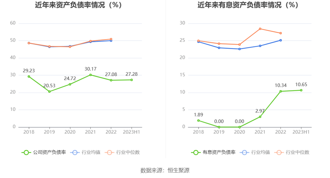 偿债能力方面,公司2023年二季度末资产负债率为27.28%,相比上年末增加0.20个百分点;有息资产负债率为10.65%,相比上年末增加0.31个百分点。