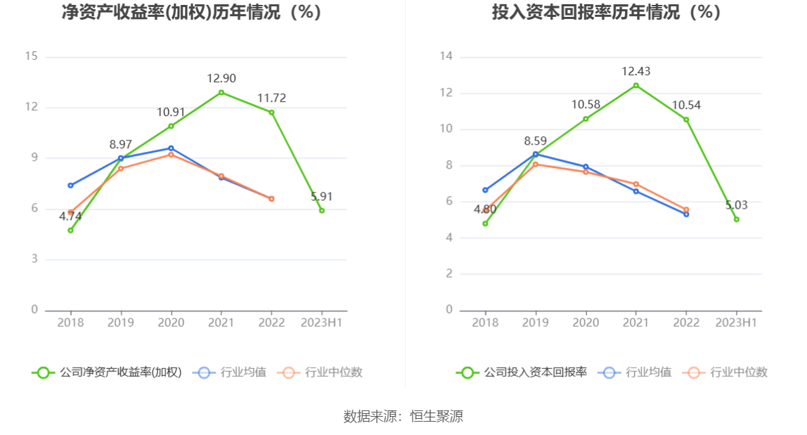 数据显示,2023年上半年公司加权平均净资产收益率为5.91%,较上年同期下降1.77个百分点;公司2023年上半年投入资本回报率为5.03%,较上年同期下降1.85个百分点。