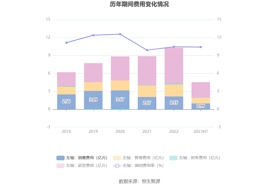 2023年上半年,公司期间费用为4.53亿元,较上年同期增加3145.75万元;期间费用率为10.41%,较上年同期上升1.41个百分点。其中,销售费用同比下降10.57%,管理费用同比增长28.0%,研发费用同比增长13.83%,财务费用同比下降78.5%。