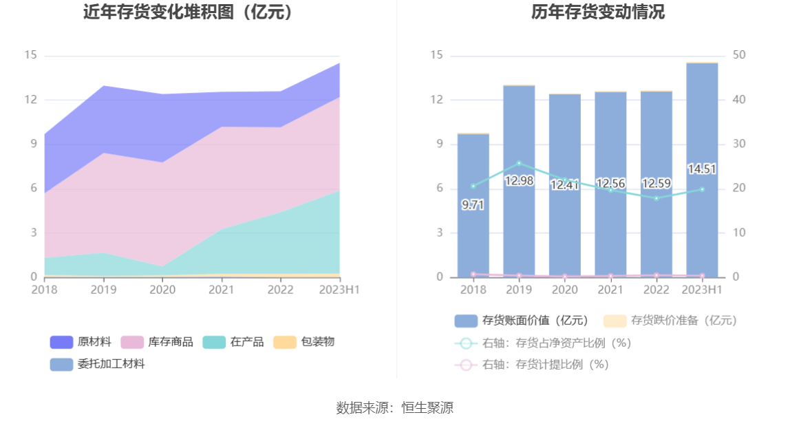从存货变动来看,截至2023年上半年末,公司存货账面价值为14.51亿元,占净资产的19.88%,较上年末增加1.92亿元。其中,存货跌价准备为602.34万元,计提比例为0.41%。