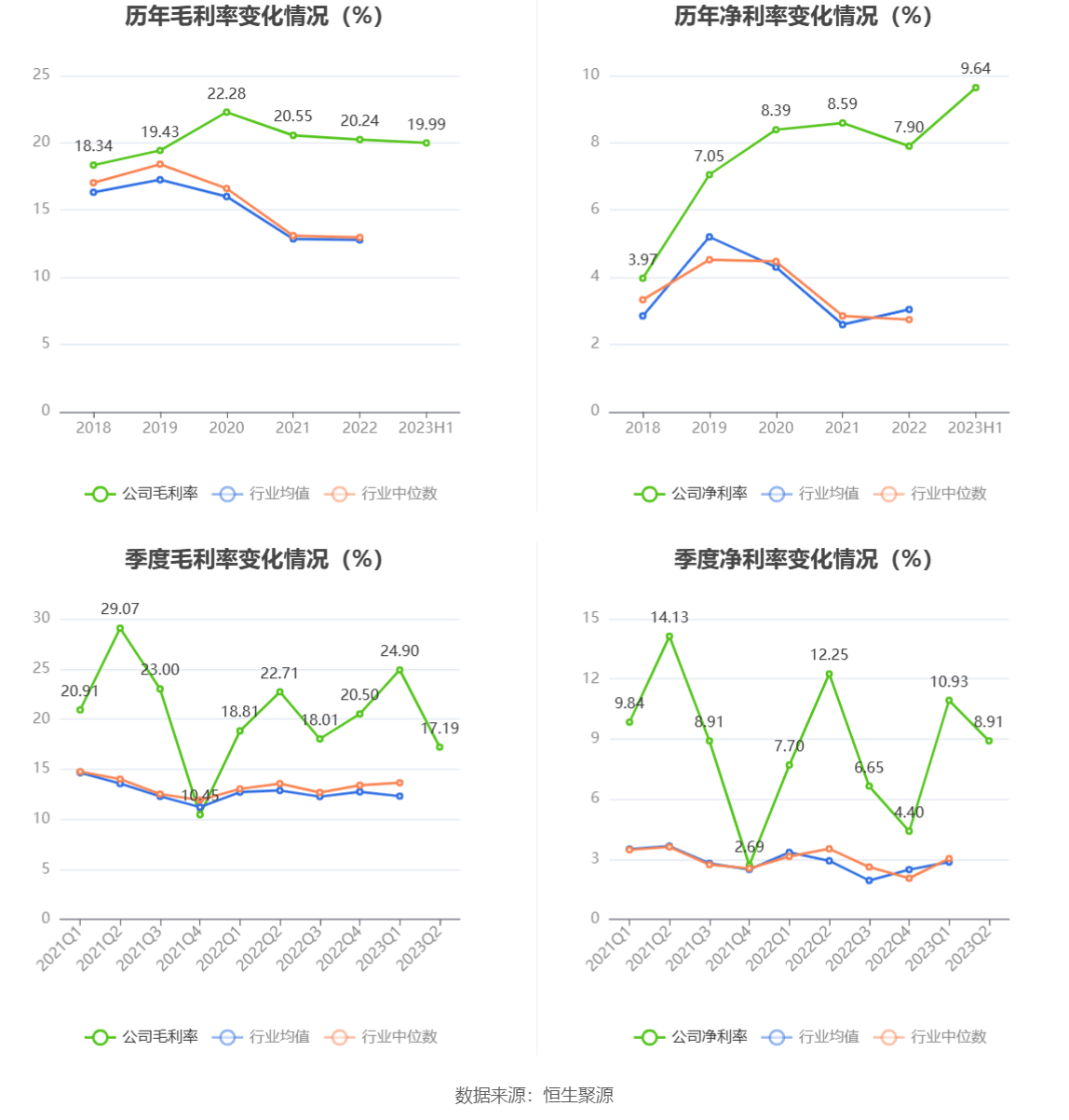 2023年上半年,公司毛利率为19.99%,同比下降1.28个百分点;净利率为9.64%,较上年同期下降0.93个百分点。从单季度指标来看,2023年第二季度公司毛利率为17.19%,同比下降5.52个百分点,环比下降7.71个百分点;净利率为8.91%,较上年同期下降3.34个百分点,较上一季度下降2.02个百分点。