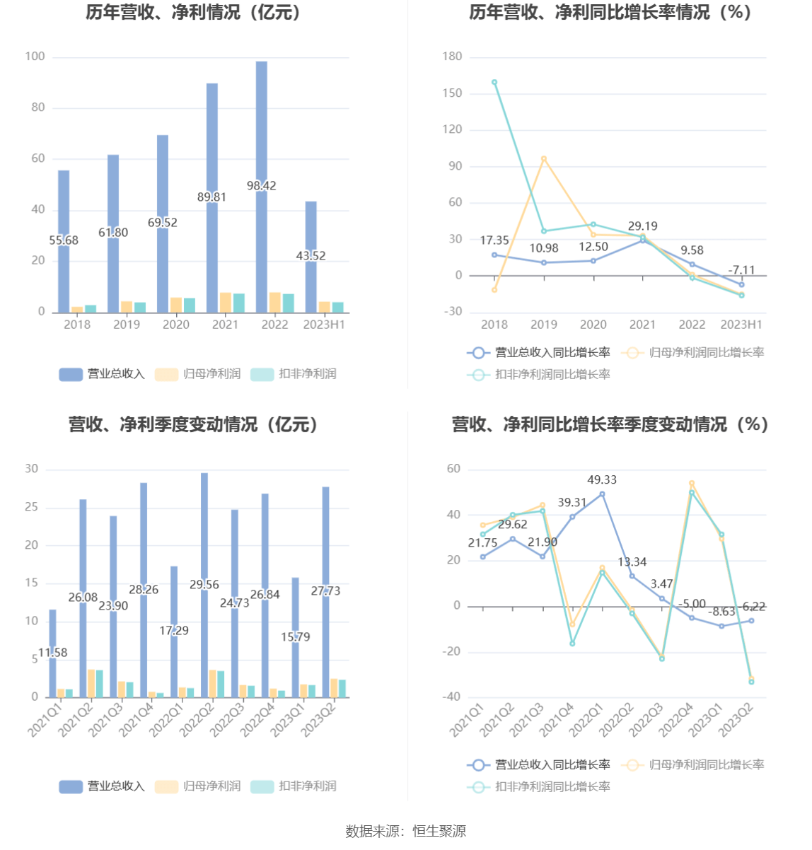 根据半年报,公司第二季度实现营业总收入27.73亿元,同比下降6.22%,环比增长75.54%;归母净利润2.49亿元,同比下降31.71%,环比增长42.06%;扣非净利润2.35亿元,同比下降33.10%,环比增长41.53%。