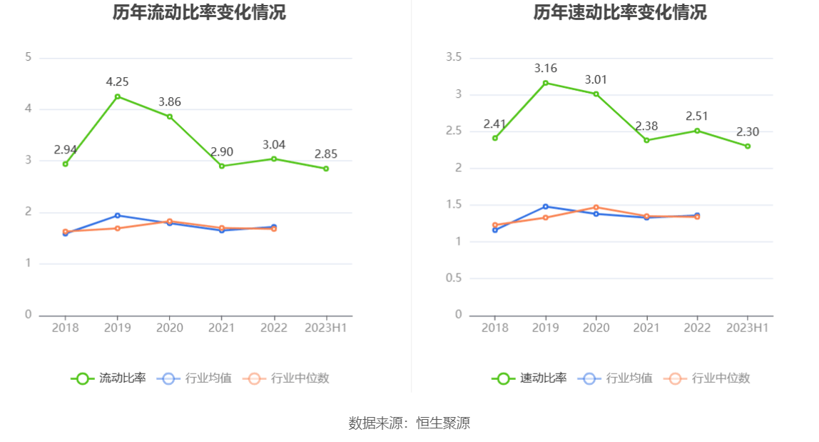 2023年上半年,公司流动比率为2.85,速动比率为2.30。