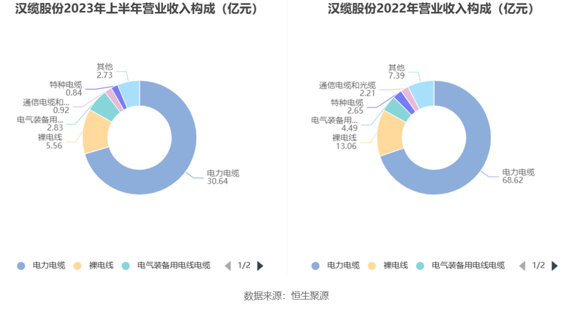 分产品来看,2023年上半年公司主营业务中,电力电缆收入30.64亿元,同比下降0.23%,占营业收入的70.41%;裸电线收入5.56亿元,同比下降30.34%,占营业收入的12.78%;电气装备用电线电缆收入2.83亿元,同比增长28.43%,占营业收入的6.51%。