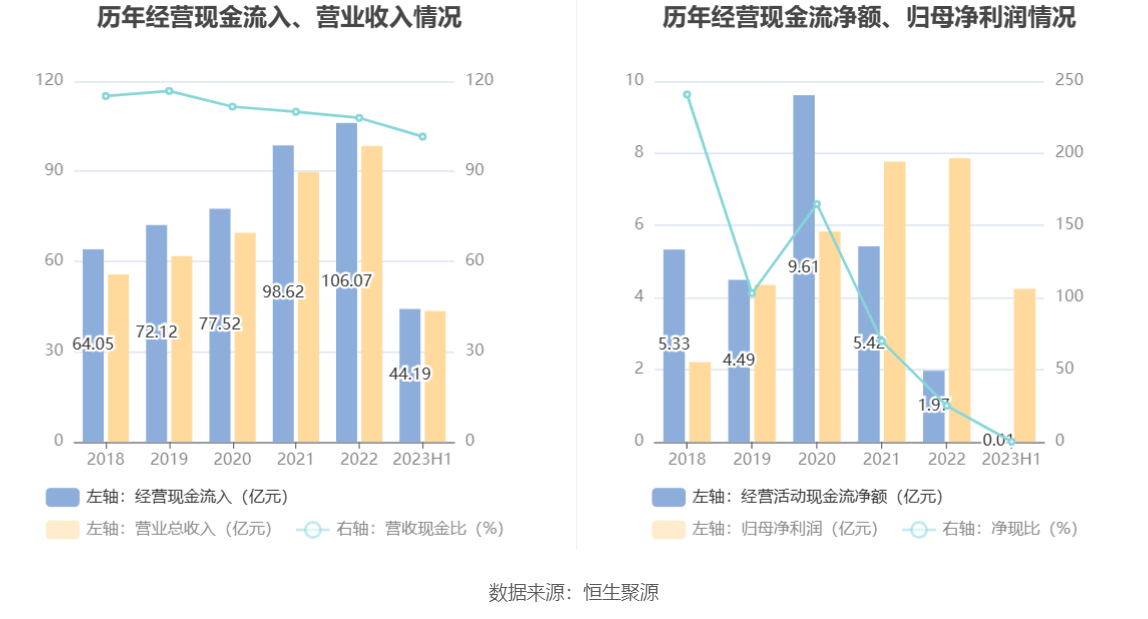 2023年上半年,公司营业收入现金比为101.54%,净现比为0.13%。