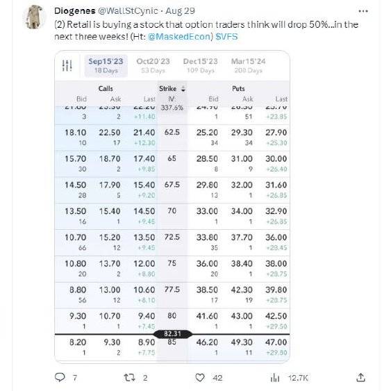 在另一条帖子中,查诺斯引用了VinFast的期权交易数据,并评论称:“散户正在买入一只期权交易者认为未来三周内将下跌50%的股票!”