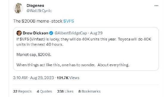 查诺斯(在X平台上的化名为“Diogenes”)转发了Albert Bridge Capital创始人德鲁·迪克森(Drew Dickson)的评论,称VinFast今年可能幸运地生产4万辆汽车,而丰田仅用40个小时就能达到这一数字。