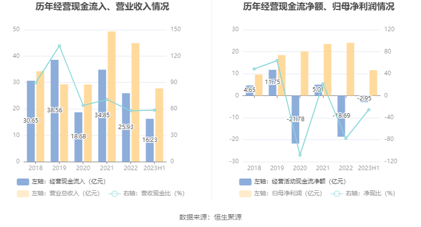 2023年上半年,公司营业收入现金比为58.50%,净现比为-25.48%。