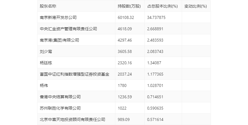 半年报显示,2023年上半年末的公司十大流通股东中,新进股东为苏州联胜化学有限公司、北京中喜天地投资顾问有限责任公司,取代了一季度末的工银瑞信基金-农业银行-工银瑞信中证金融资产管理计划、博时基金-农业银行-博时中证金融资产管理计划。在具体持股比例上,刘少鸾、富国中证红利指数增强型证券投资基金、杨伟持股有所上升,南京港(集团)有限公司、杨廷栋、香港中央结算有限公司持股有所下降。