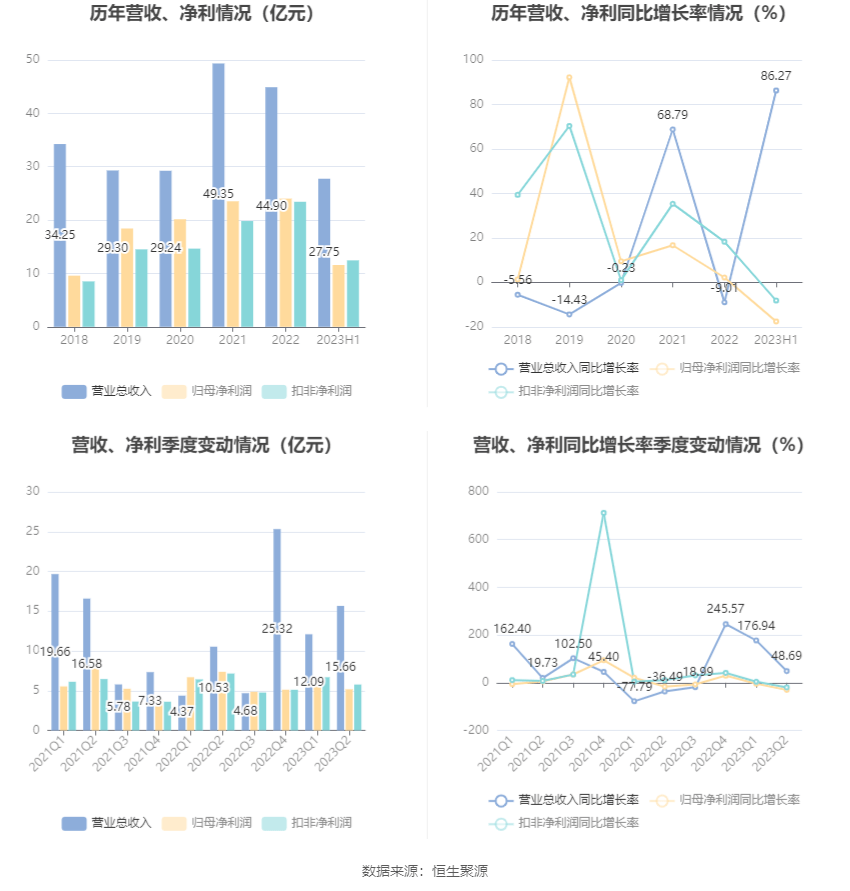 根据半年报,公司第二季度实现营业总收入15.66亿元,同比增长48.69%,环比增长29.54%;归母净利润5.17亿元,同比下降29.86%,环比下降19.47%;扣非净利润5.77亿元,同比下降19.38%,环比下降13.80%。