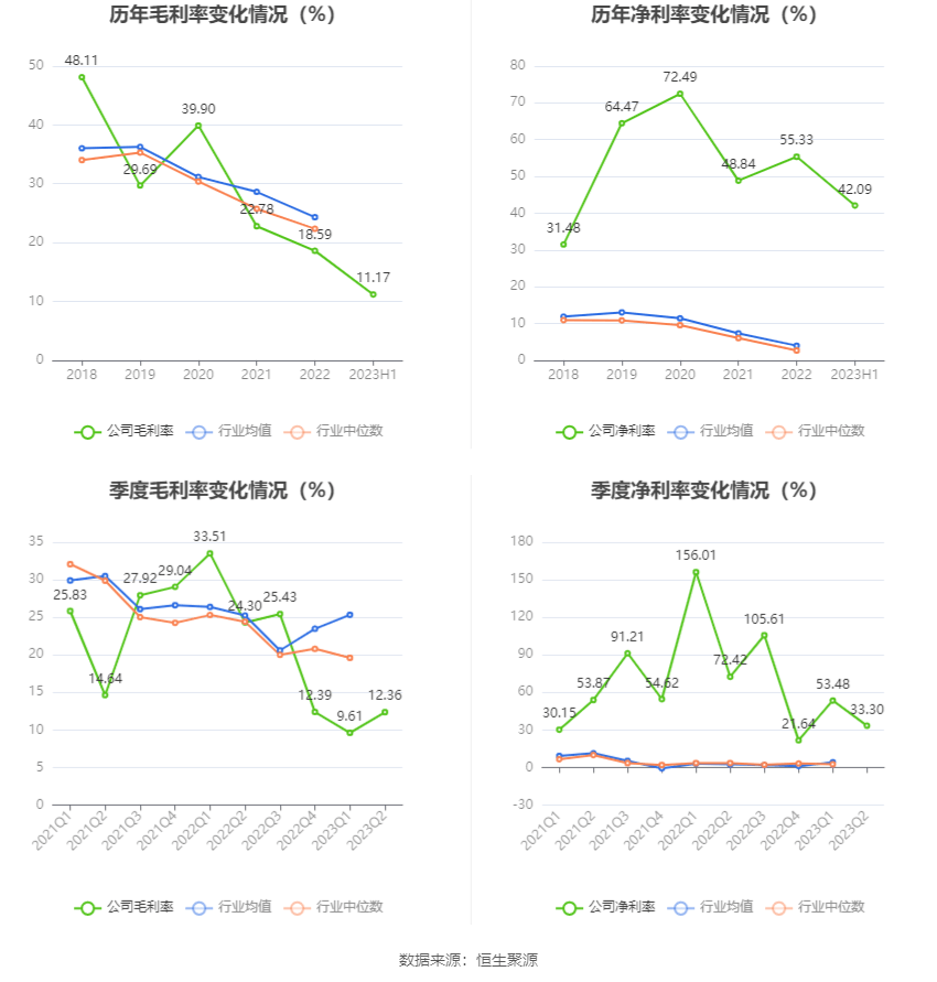 2023年上半年,公司毛利率为11.17%,同比下降15.83个百分点;净利率为42.09%,较上年同期下降54.83个百分点。从单季度指标来看,2023年第二季度公司毛利率为12.36%,同比下降11.94个百分点,环比上升2.75个百分点;净利率为33.30%,较上年同期下降39.12个百分点,较上一季度下降20.18个百分点。