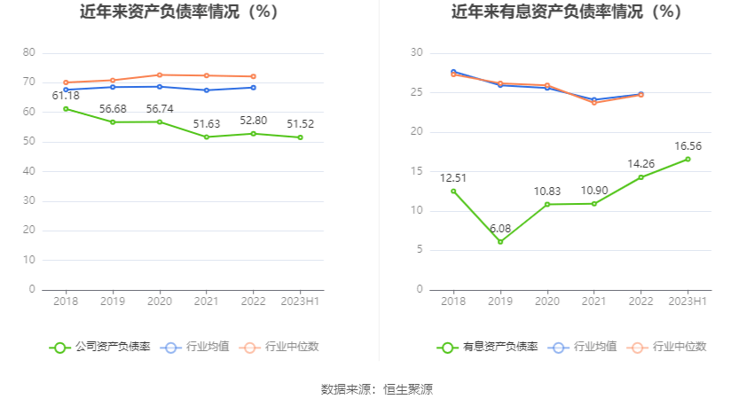 偿债能力方面,公司2023年二季度末资产负债率为51.52%,相比上年末减少1.28个百分点;有息资产负债率为16.56%,相比上年末增加2.30个百分点。