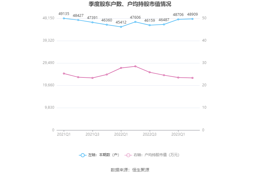 筹码集中度方面,截至2023年二季度末,公司股东总户数为4.89万户,较一季度末增长了203户,增幅0.42%;户均持股市值由一季度末的23.55万元下降至23.39万元,降幅为0.68%。