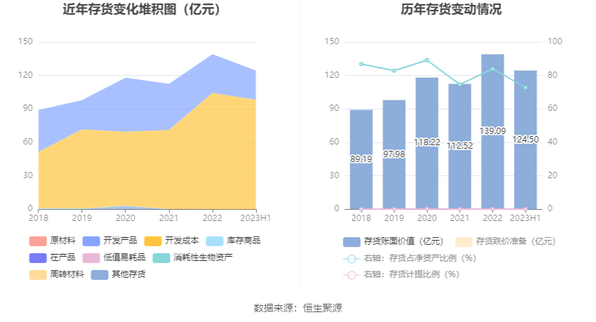 从存货变动来看,截至2023年上半年末,公司存货账面价值为124.5亿元,占净资产的72.82%,较上年末减少14.59亿元。其中,存货跌价准备为1220.38万元,计提比例为0.1%。