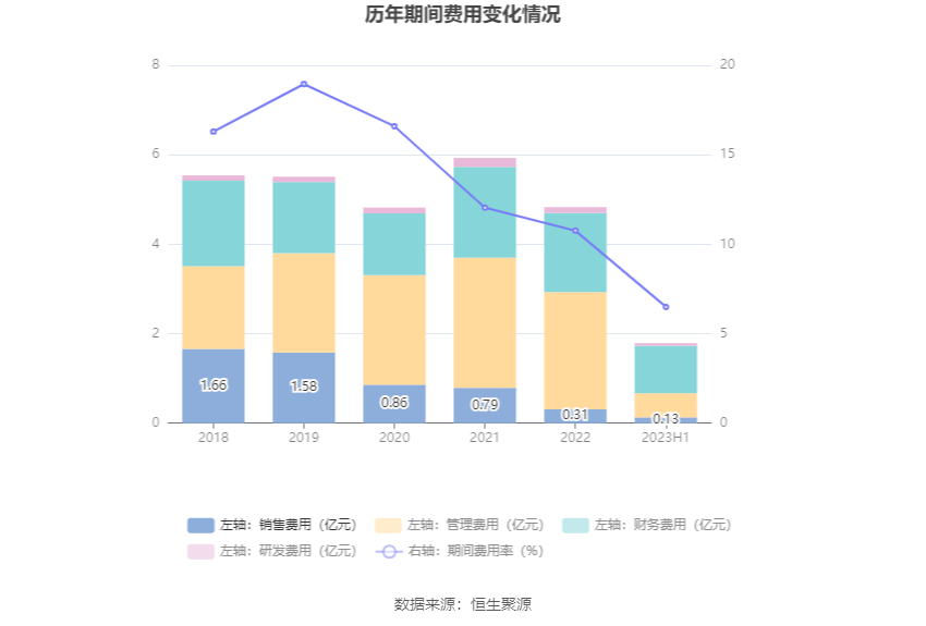 2023年上半年,公司期间费用为1.80亿元,较上年同期增加249.30万元;但期间费用率为6.50%,较上年同期下降5.46个百分点。其中,销售费用同比下降30.69%,管理费用同比下降21.33%,研发费用同比增长43.49%,财务费用同比增长24.92%。