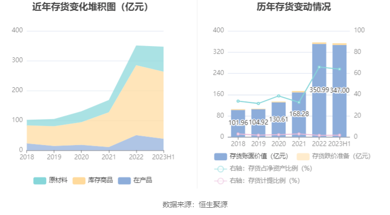 从存货变动来看,截至2023年上半年末,公司存货账面价值为347.0亿元,占净资产的64.0%,较上年末减少4.0亿元。其中,存货跌价准备为6.31亿元,计提比例为1.79%。