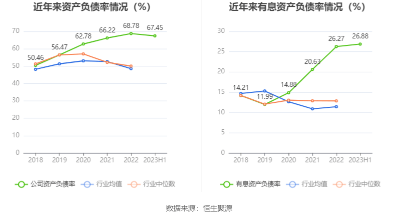 偿债能力方面,公司2023年二季度末资产负债率为67.45%,相比上年末减少1.33个百分点;有息资产负债率为26.88%,相比上年末增加0.61个百分点。