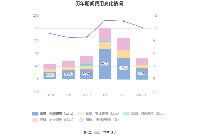 2023年上半年,公司期间费用为62.76亿元,较上年同期增加4.02亿元;期间费用率为12.24%,较上年同期上升1.33个百分点。其中,销售费用同比下降5.67%,管理费用同比增长10.82%,研发费用同比增长13.27%,财务费用由去年同期的-5.78亿元变为-3.17亿元。