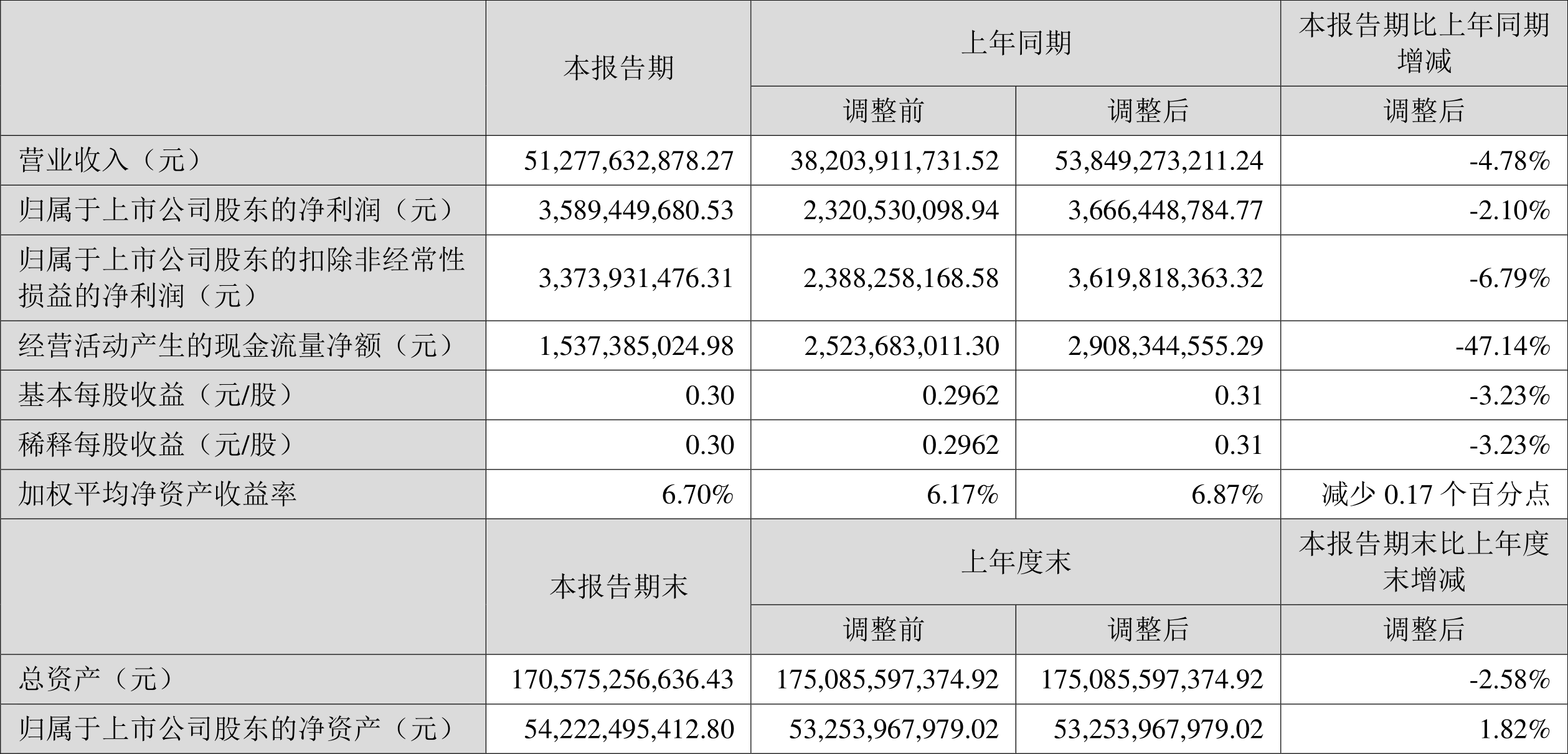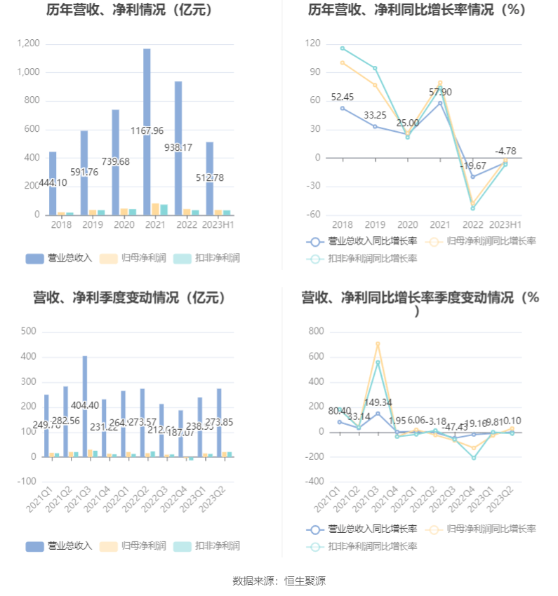 根据半年报,公司第二季度实现营业总收入273.85亿元,同比增长0.10%,环比增长14.61%;归母净利润20.66亿元,同比增长29.35%,环比增长35.63%;扣非净利润20.7亿元,同比下降10.81%,环比增长58.78%。