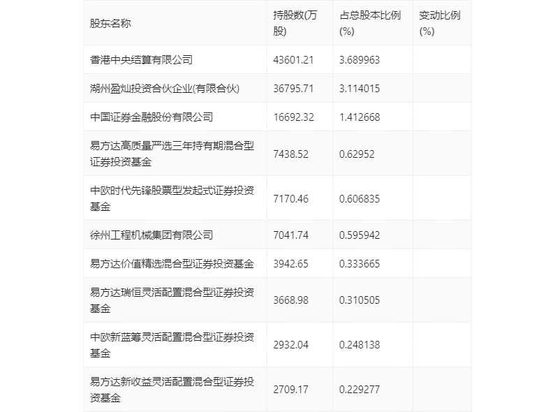半年报显示,2023年上半年末的公司十大流通股东中,新进股东为徐州工程机械集团有限公司、中欧新蓝筹灵活配置混合型证券投资基金,取代了一季度末的中欧阿尔法混合型证券投资基金、中国人寿保险股份有限公司-传统-普通保险产品-005L-CT001沪。在具体持股比例上,香港中央结算有限公司、中欧时代先锋股票型发起式证券投资基金、易方达价值精选混合型证券投资基金持股有所上升,易方达瑞恒灵活配置混合型证券投资基金持股有所下降。