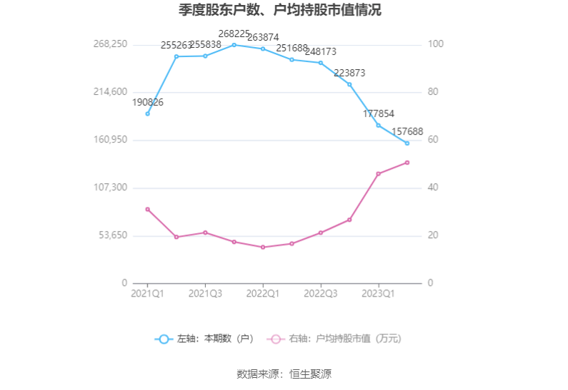 筹码集中度方面,截至2023年二季度末,公司股东总户数为15.77万户,较一季度末下降了2.02万户,降幅11.34%;户均持股市值由一季度末的46.04万元上升至50.73万元,增幅为10.19%。
