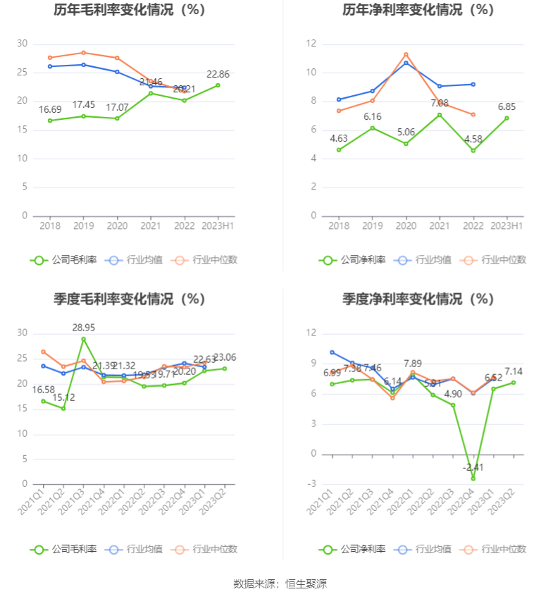 2023年上半年,公司毛利率为22.86%,同比上升2.45个百分点;净利率为6.85%,较上年同期下降0.03个百分点。从单季度指标来看,2023年第二季度公司毛利率为23.06%,同比上升3.53个百分点,环比上升0.43个百分点;净利率为7.14%,较上年同期上升1.23个百分点,较上一季度上升0.62个百分点。