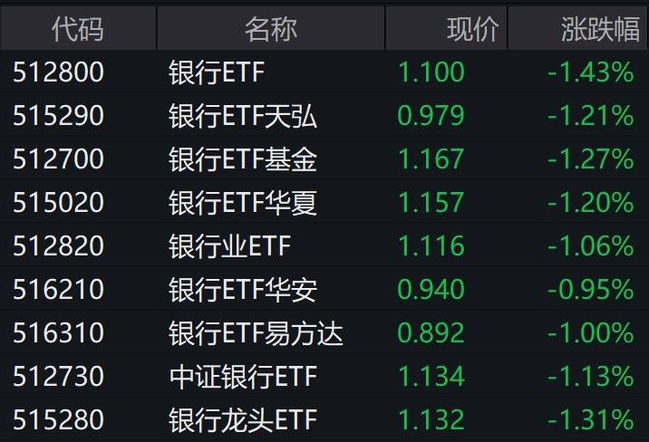 受盘面影响,多只跟踪中证银行指数的ETF跌逾1%。