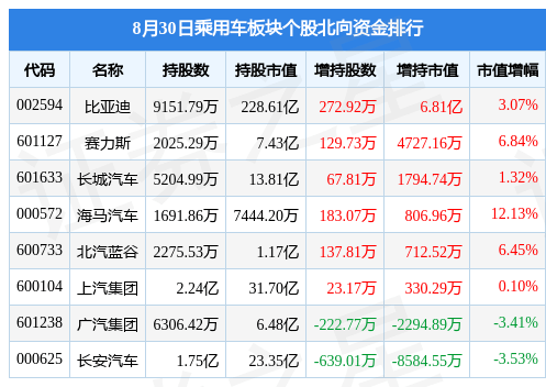 8月30日乘用车板块较上一交易日下跌0.14%,长安汽车领跌。当日上证指数报收于3137.14,上涨0.04%。深证成指报收于10482.5,上涨0.26%。乘用车板块个股涨跌见下表: