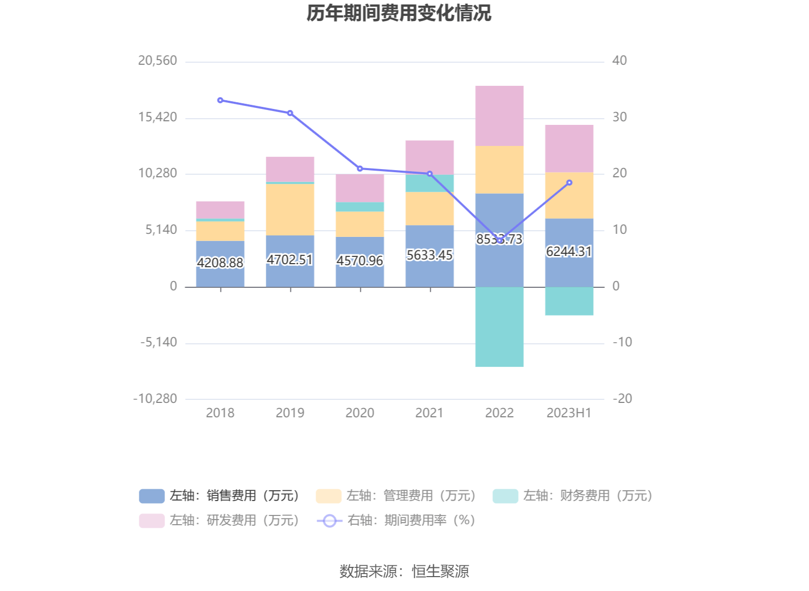 2023年上半年,公司期间费用为1.22亿元,较上年同期增加7512.28万元;期间费用率为18.53%,较上年同期上升9.12个百分点。其中,销售费用同比增长118.32%,管理费用同比增长113.95%,研发费用同比增长86.98%,财务费用由去年同期的-2464.27万元变为-2596.07万元。