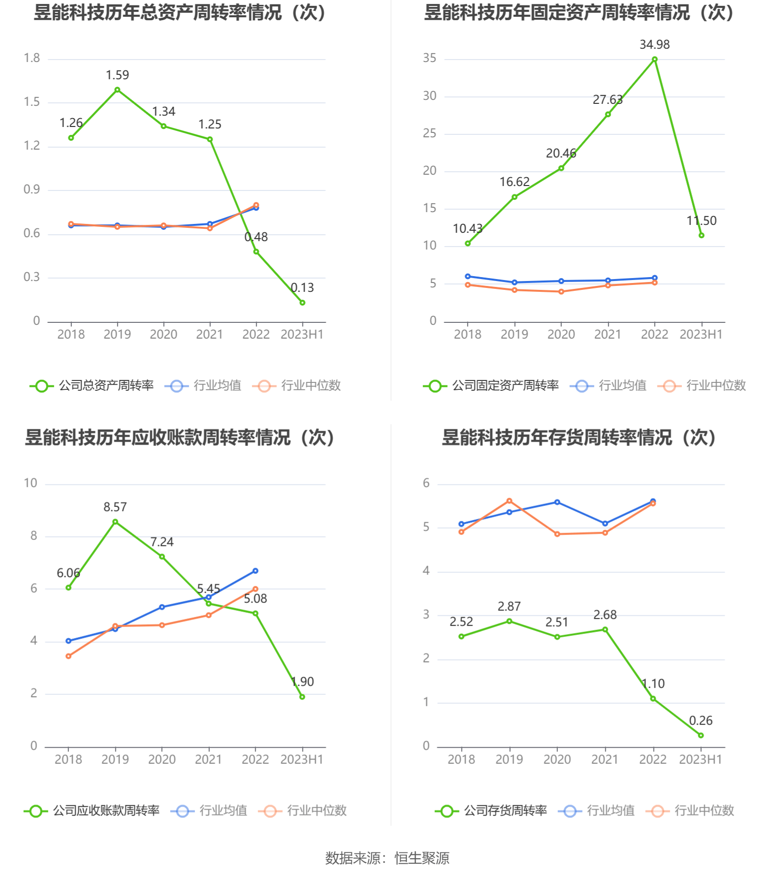 营运能力方面,2023年上半年,公司总资产周转率为0.13次,上年同期为0.22次(2022年上半年行业平均值为0.37次,公司位居同行业53/61);固定资产周转率为11.50次,上年同期为19.11次(2022年上半年行业平均值为2.75次,公司位居同行业2/61);公司应收账款周转率、存货周转率分别为1.90次、0.26次。