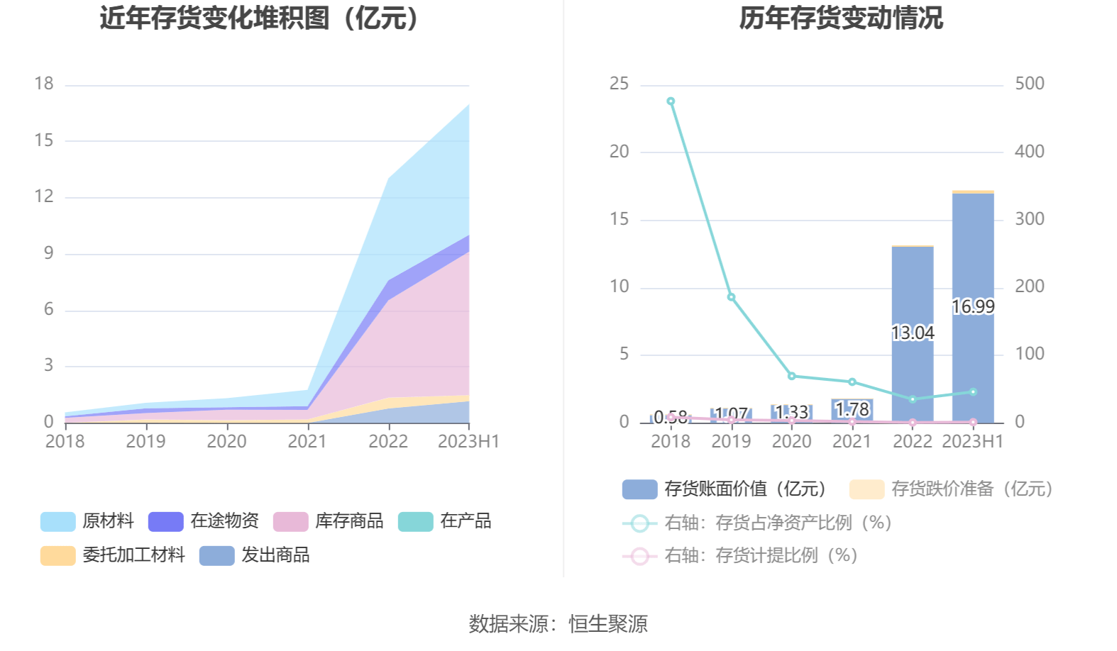 从存货变动来看,截至2023年上半年末,公司存货账面价值为16.99亿元,占净资产的46.07%,较上年末增加3.95亿元。其中,存货跌价准备为2247.31万元,计提比例为1.31%。