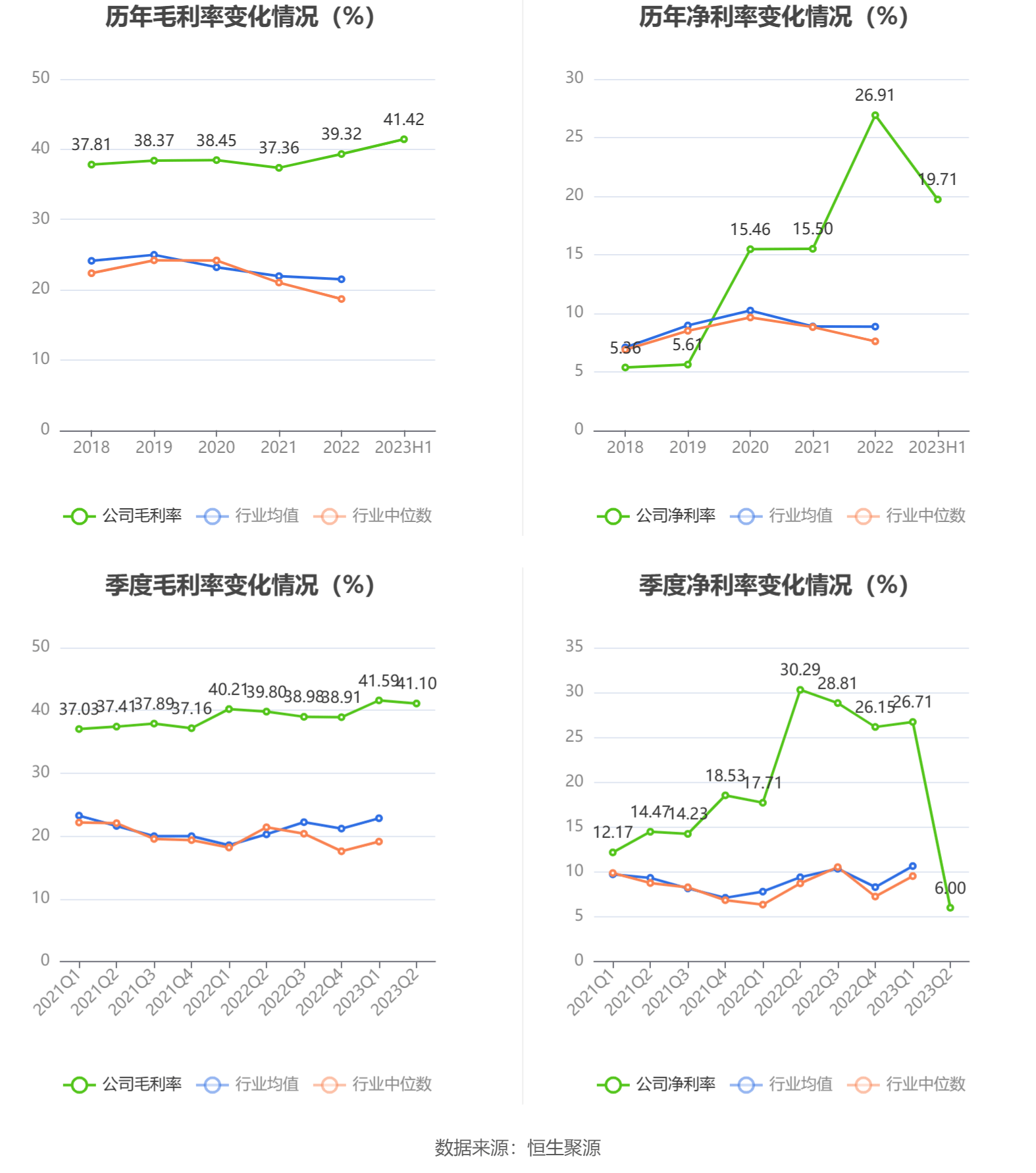 2023年上半年,公司毛利率为41.42%,同比上升1.48个百分点;净利率为19.71%,较上年同期下降6.19个百分点。从单季度指标来看,2023年第二季度公司毛利率为41.10%,同比上升1.30个百分点,环比下降0.49个百分点;净利率为6.00%,较上年同期下降24.29个百分点,较上一季度下降20.71个百分点。