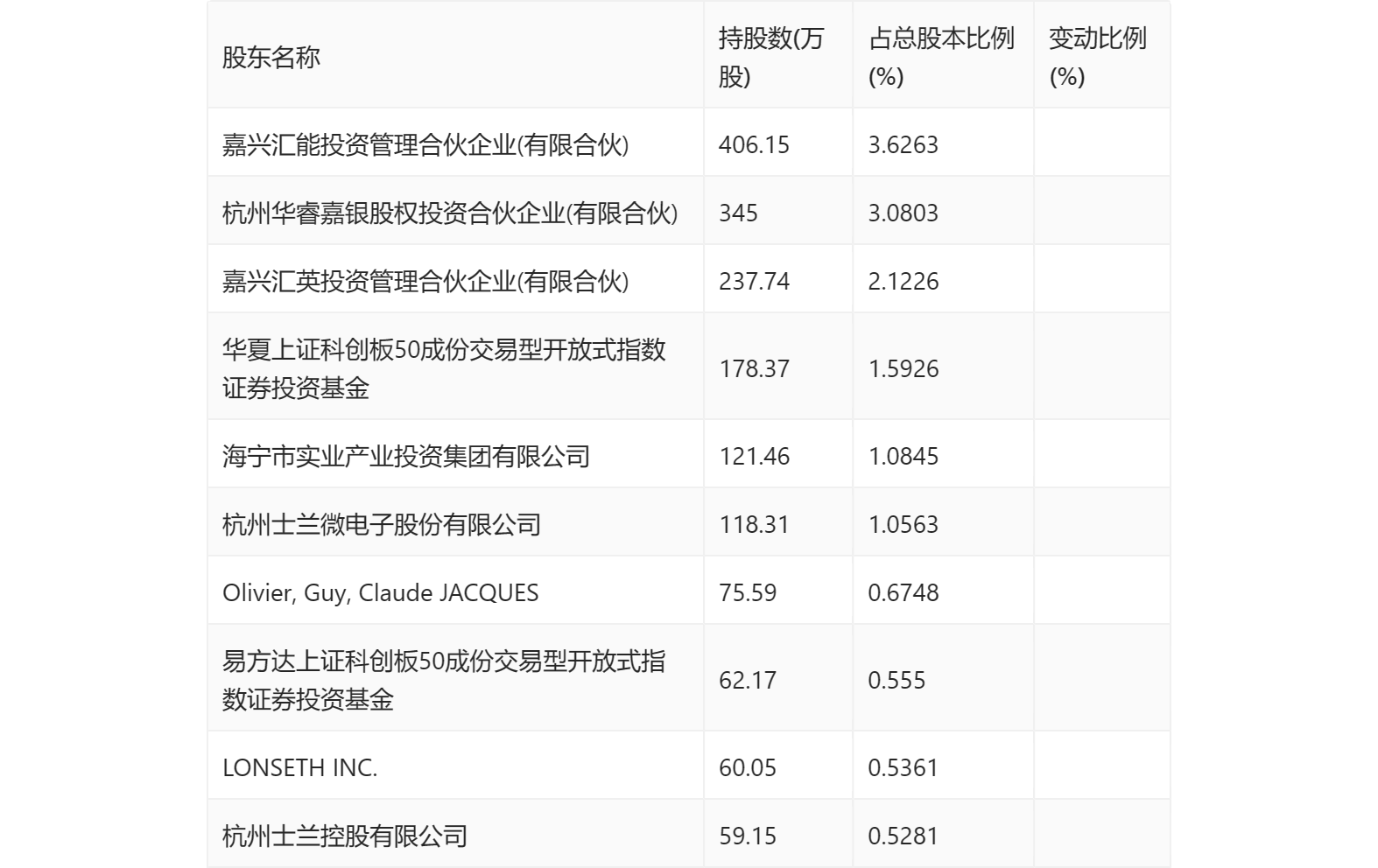 半年报显示,2023年上半年末的公司十大流通股东中,新进股东为嘉兴汇能投资管理合伙企业(有限合伙)、杭州华睿嘉银股权投资合伙企业(有限合伙)、嘉兴汇英投资管理合伙企业(有限合伙)、海宁市实业产业投资集团有限公司、杭州士兰微电子股份有限公司、Olivier, Guy, Claude JACQUES、LONSETH INC.、杭州士兰控股有限公司。在具体持股比例上,华夏上证科创板50成份交易型开放式指数证券投资基金持股有所上升,易方达上证科创板50成份交易型开放式指数证券投资基金持股有所下降。