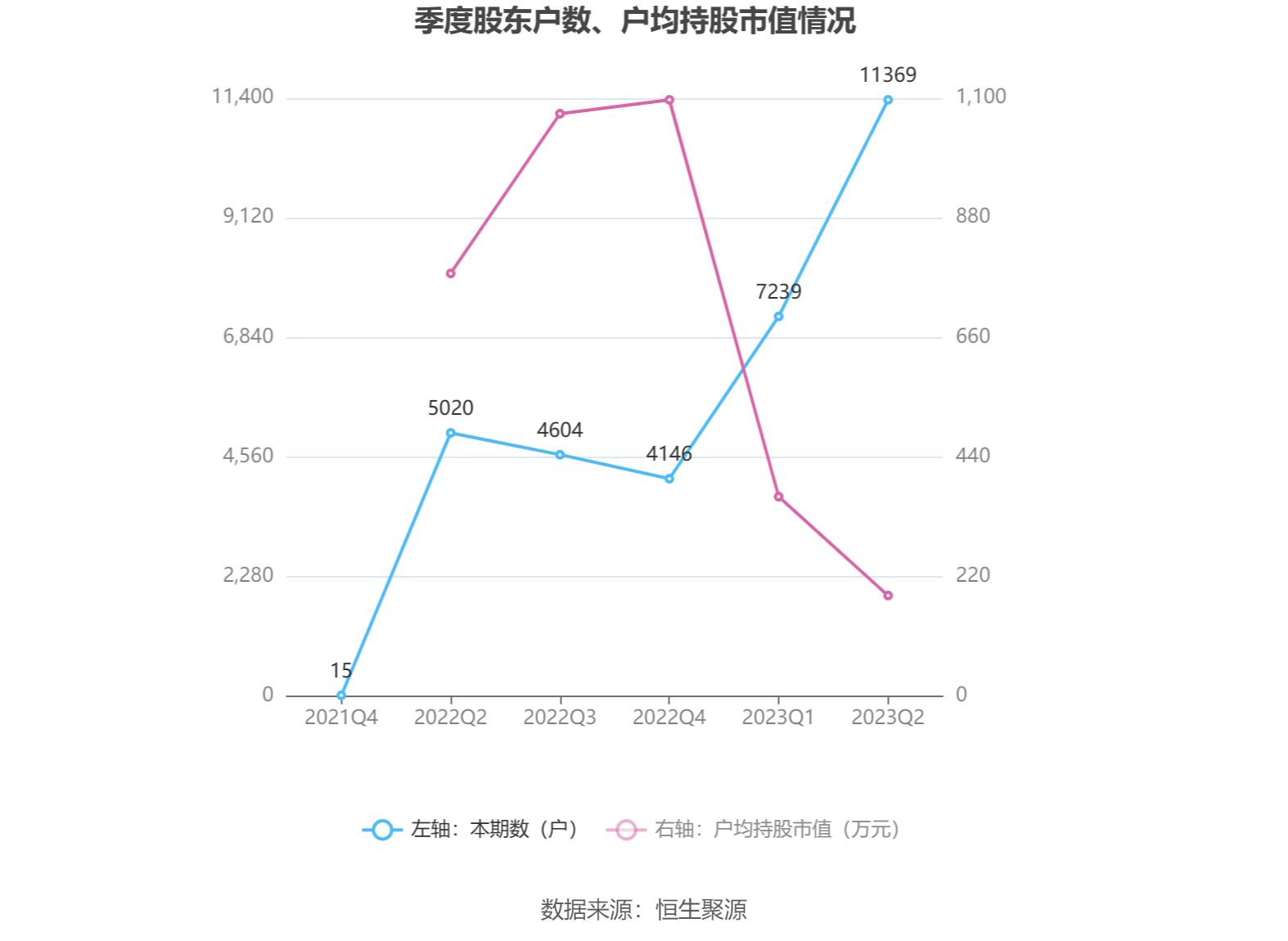 筹码集中度方面,截至2023年二季度末,公司股东总户数为1.14万户,较一季度末增长了4130户,增幅57.05%;户均持股市值由一季度末的366.98万元下降至185.04万元,降幅为49.58%。