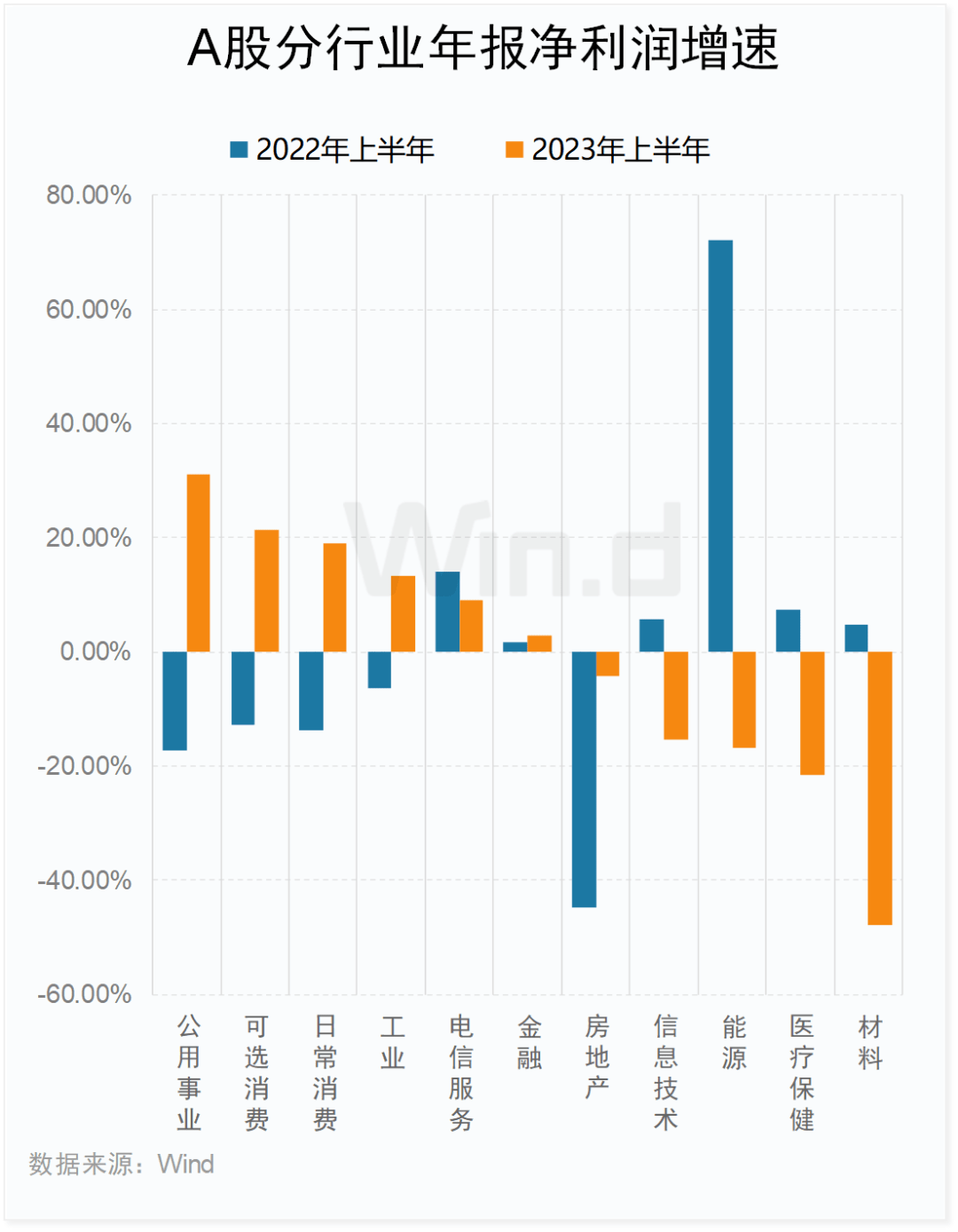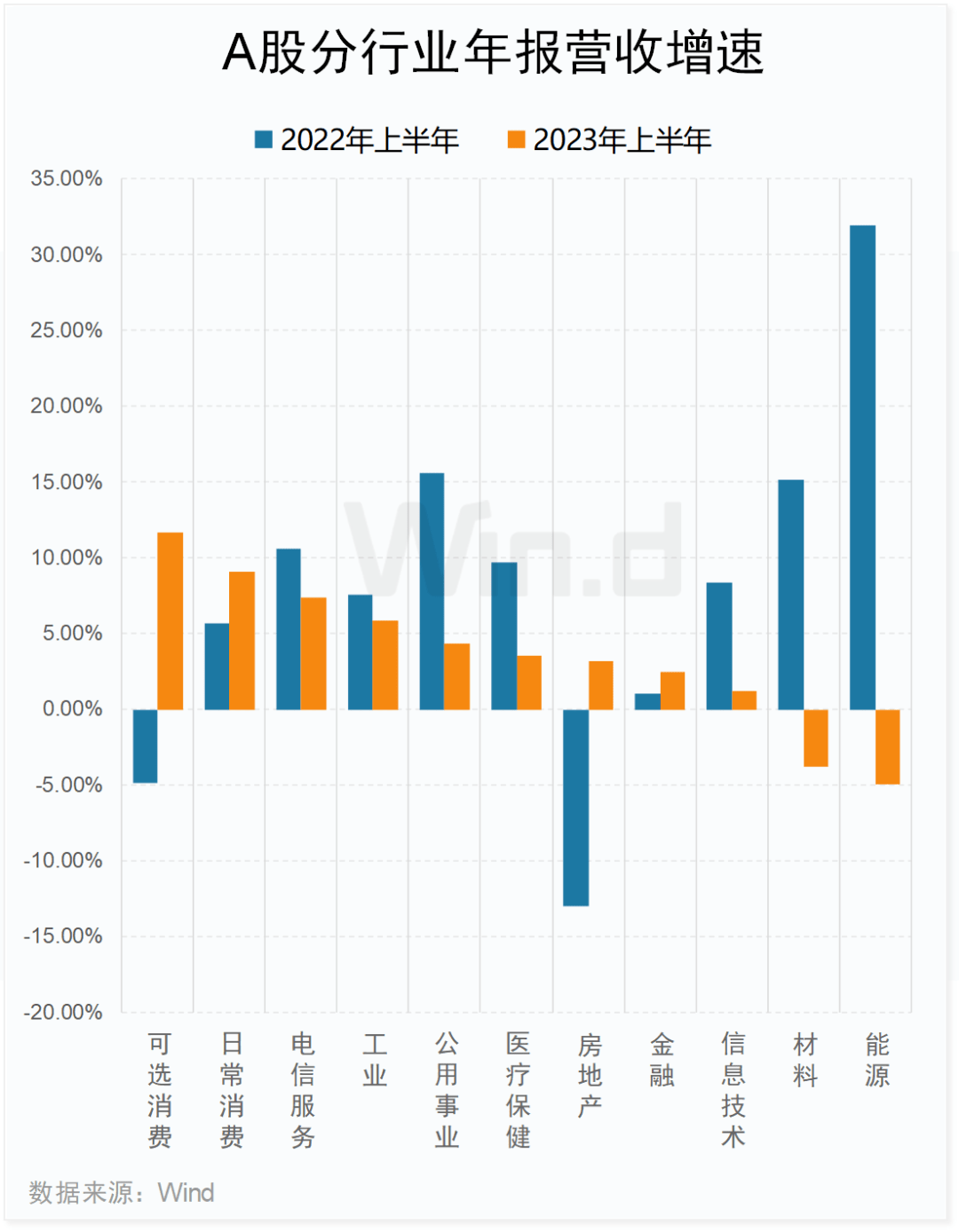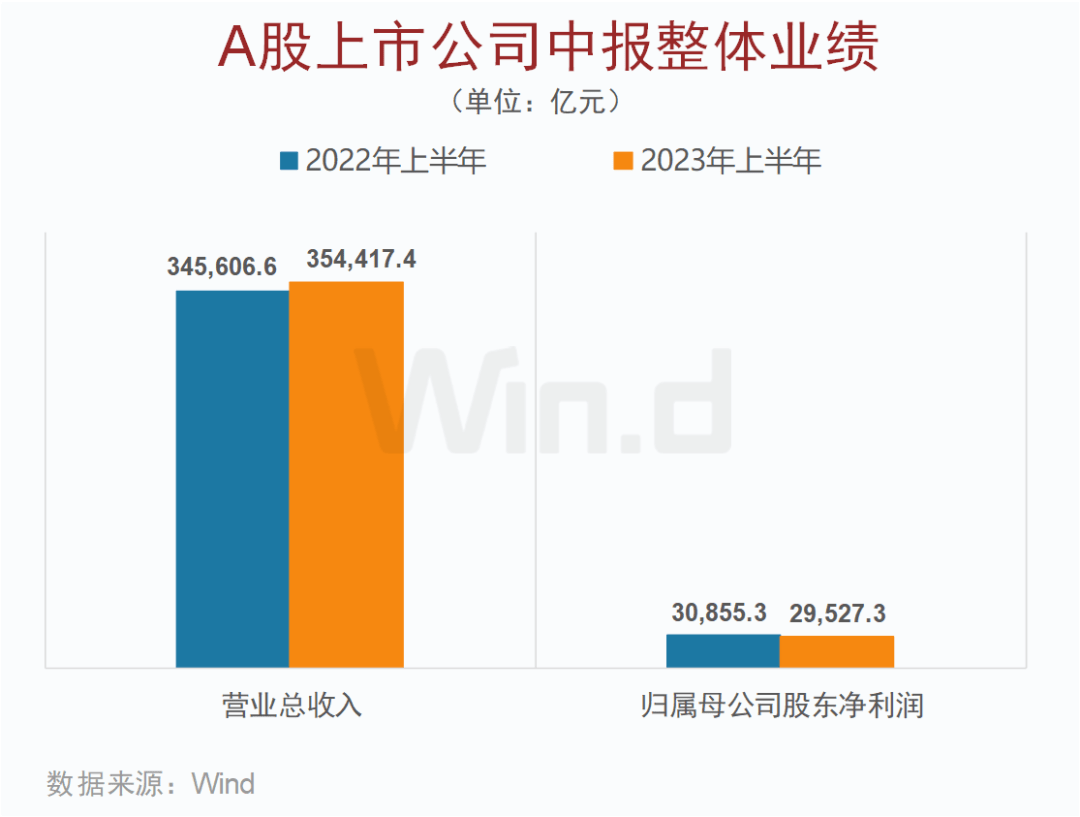 Wind数据显示,2023年上半年,A股上市公司营业收入合计为35.44万亿元,同比增长2.57%;实现归母净利润2.95万亿元,同比下降4.3%。