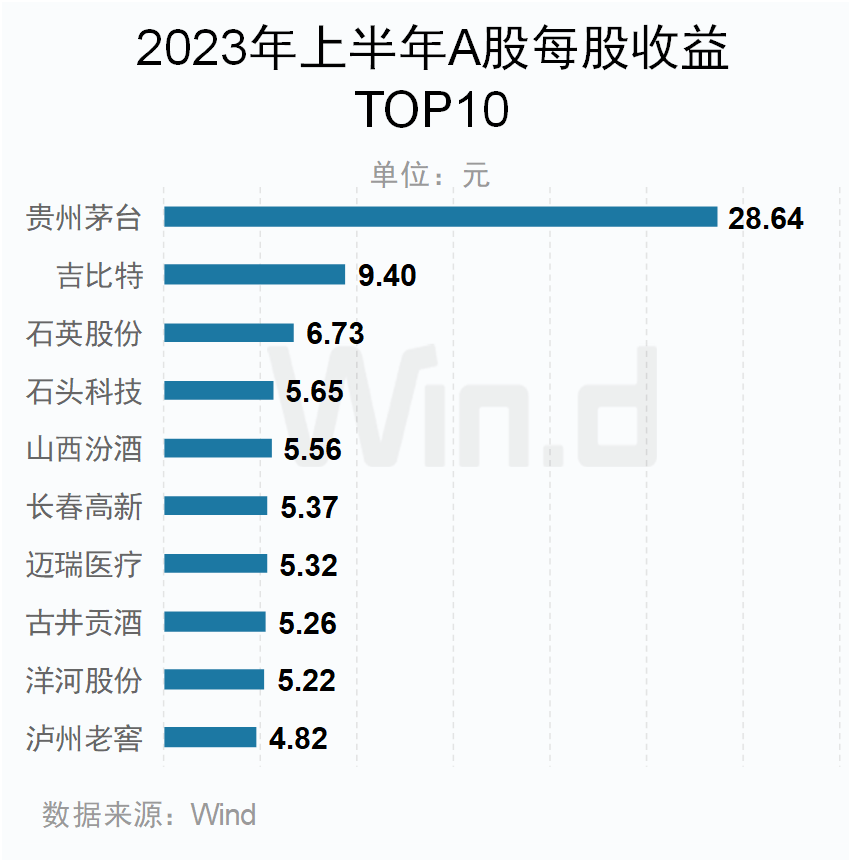 每股盈利方面,上半年贵州茅台以28.64元的每股收益稳居榜首。