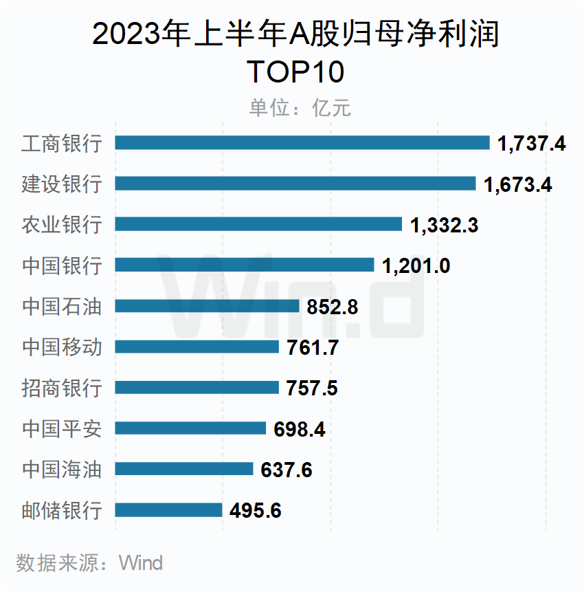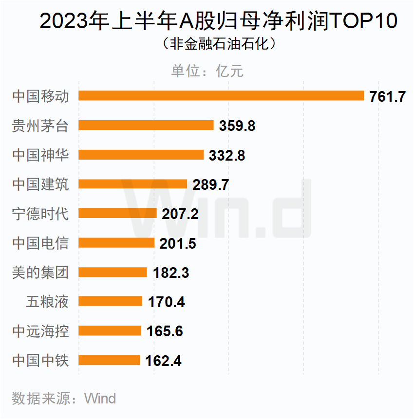 剔除两油金融类公司后,中国移动以761.7亿元的净利润位居第一;贵州茅台和中国神华紧随其后,上半年盈利均超300亿元。