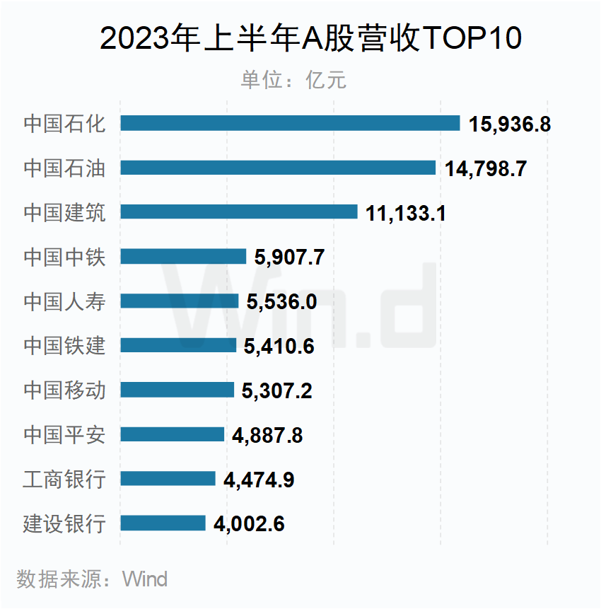 2023年上半年营收排行榜中,前三名齐超万亿,“两桶油”稳居榜单前二名。