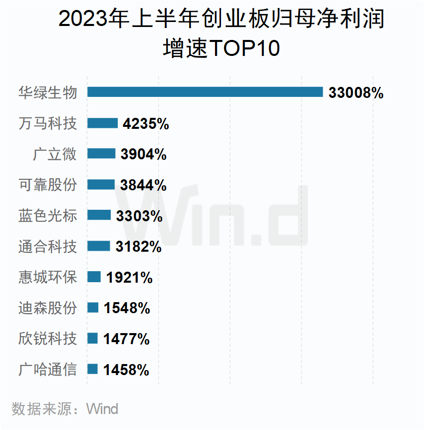 创业板企业中,华绿生物以330倍的净利润增速稳居榜单第一。