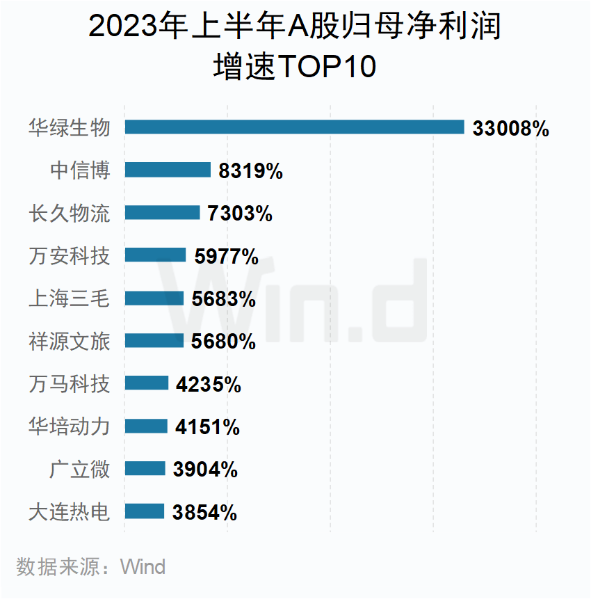 从净利润增幅来看,华绿生物、中信博、长久物流排名居前,上半年净利润增幅分别为33008%、8319%、7303%。