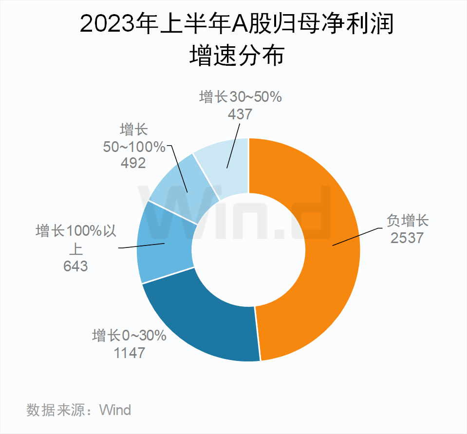 从上市公司中报业绩分布来看,上半年A股共有2719家公司实现归母净利润正增长,占比52%。其中净利润增长100%以上的公司643家,50%-100%之间的有492家,50%以下的1584家,占比分别为12%,9%及30%。此外,2537家公司净利润呈现负增长局面。